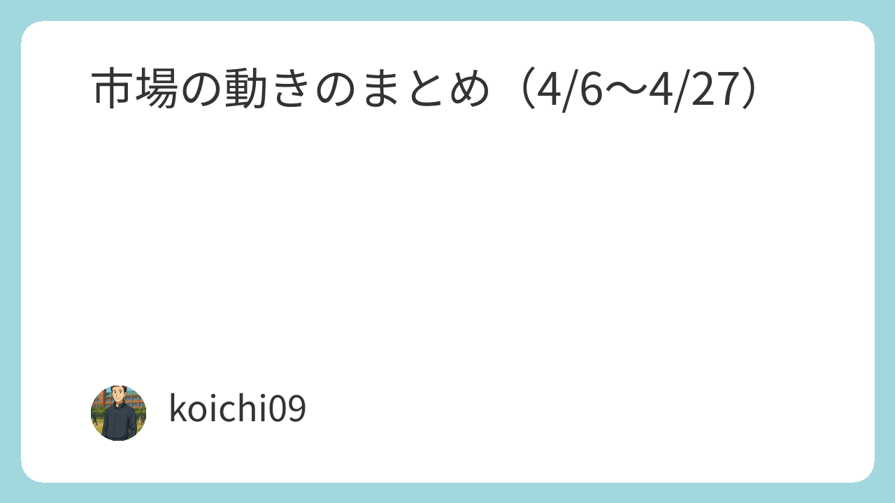 米国: 停戦合意(4/8)→過熱感→停戦延長(4/21)→協議再開(4/24)という中東情勢の流れに連動しつつ、決算シーズンと半導体・AI株がS&P500を最高値更新まで牽引。期間中+8.8%の上昇。